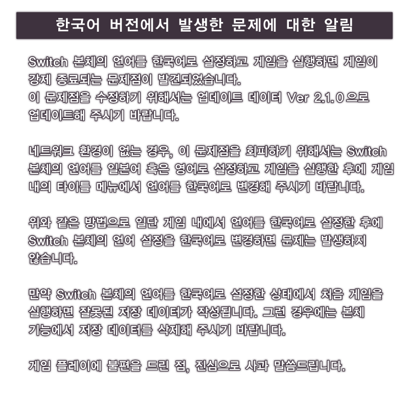 - Nintendo Switch 버전의 업데이트 패치(Ver.3.1.1)가 공개되 었습니다. 자세한 내용은 [PRODUCT]을 확인해 주십시오.
